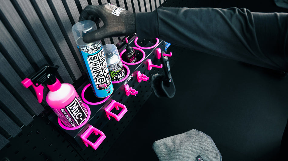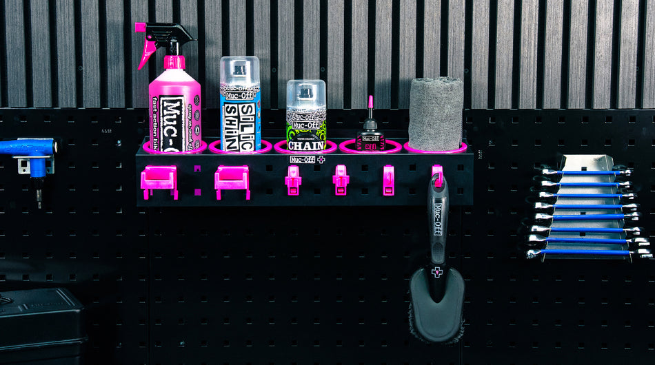 Introducing the Expert Muc-Off Bottle and Detailing Store Rack bundle. functional organiser is the ultimate way to stash your detailing gear and keep those MO favourites within arm’s reach. Designed to hold multiple bottles and aerosols up top, the rack also features clips and hooks, perfect for hanging cloths, brushes, extra bottles, and other cleaning essentials. Crafted from robust materials to handle the demands of any workshop, this rack is as practical as it is stylish. Easily mount it to your workshop or garage wall for a clean, pro-grade set-up that keeps everything tidy and ready for action. With the Muc-Off Rack, your gear stays sorted so you can focus on what matters most: keeping it pinned!